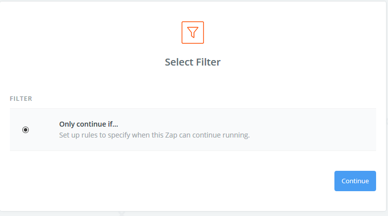 After setting up a Zap like the one described above, add a Filter step by clicking the Plus sign between the first and second steps of the Zap on the left-hand side, and click the “Filter” option that appears: