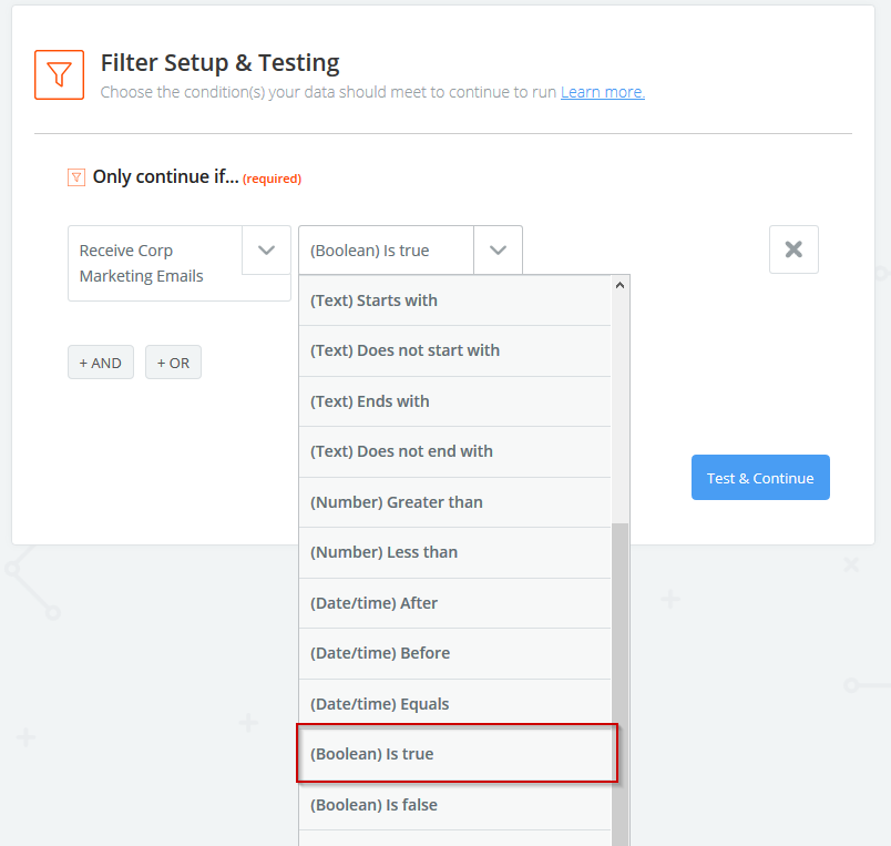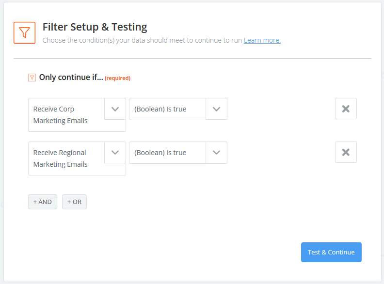 Select the appropriate Marketing opt-in value in the left drop-down (either “Receive Regional Marketing Emails” or “Receive Corp Marketing Emails” ), and “(Boolean) Is true” in the right drop-down.